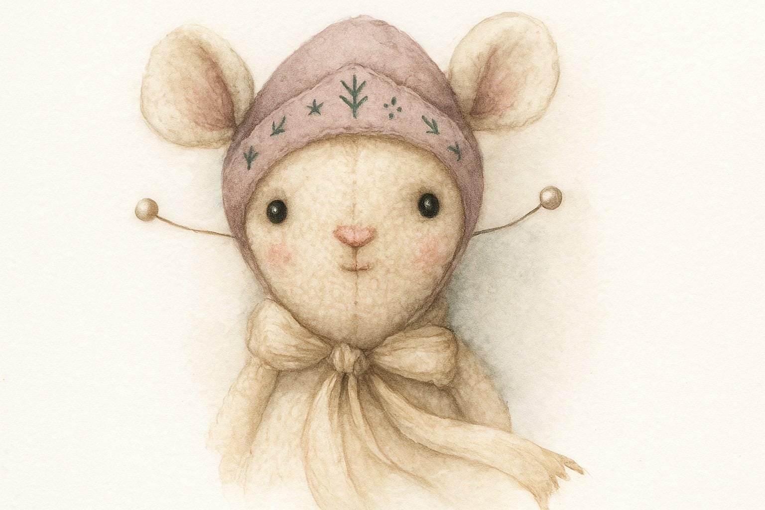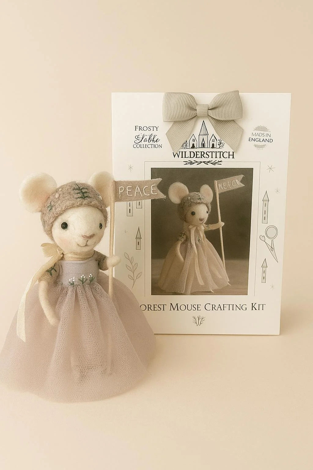 As you sew, her little world begins to unfold — a mouse of courage and kindness, wrapped in layers of tulle and wonder, carrying her tiny flag of peace through the frost-tipped trees.