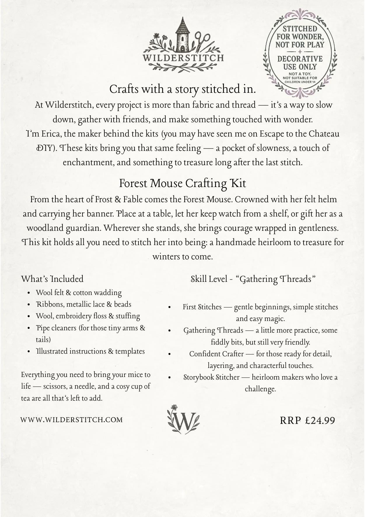 Now, you can bring her to life with your own hands. This Sew Your Own Guardian Mouse Kit is a gentle, story-filled project made for slow, mindful making. Stitch by stitch, you’ll shape her from soft batting, felt, wool, and wire — materials chosen for their natural texture and quiet beauty.